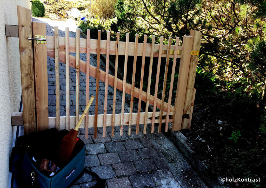 Dieses Lärchen Gartentor ist unbehandelt, also es wurde weder gestrichen noch imprägniert. Über die Jahre wird es natürlich vergrauen und bekommt somit eine wunderschöne Patina. Hier wurde extrem auf den Konstruktiven Holzschutz geachtet. Dieses bedeutet Wasser muss an allen stellen ablaufen können. Daher wurde die Köpfe schräg geschnitten, der Anschlagpfosten in einen Beton H-Anker montiert …